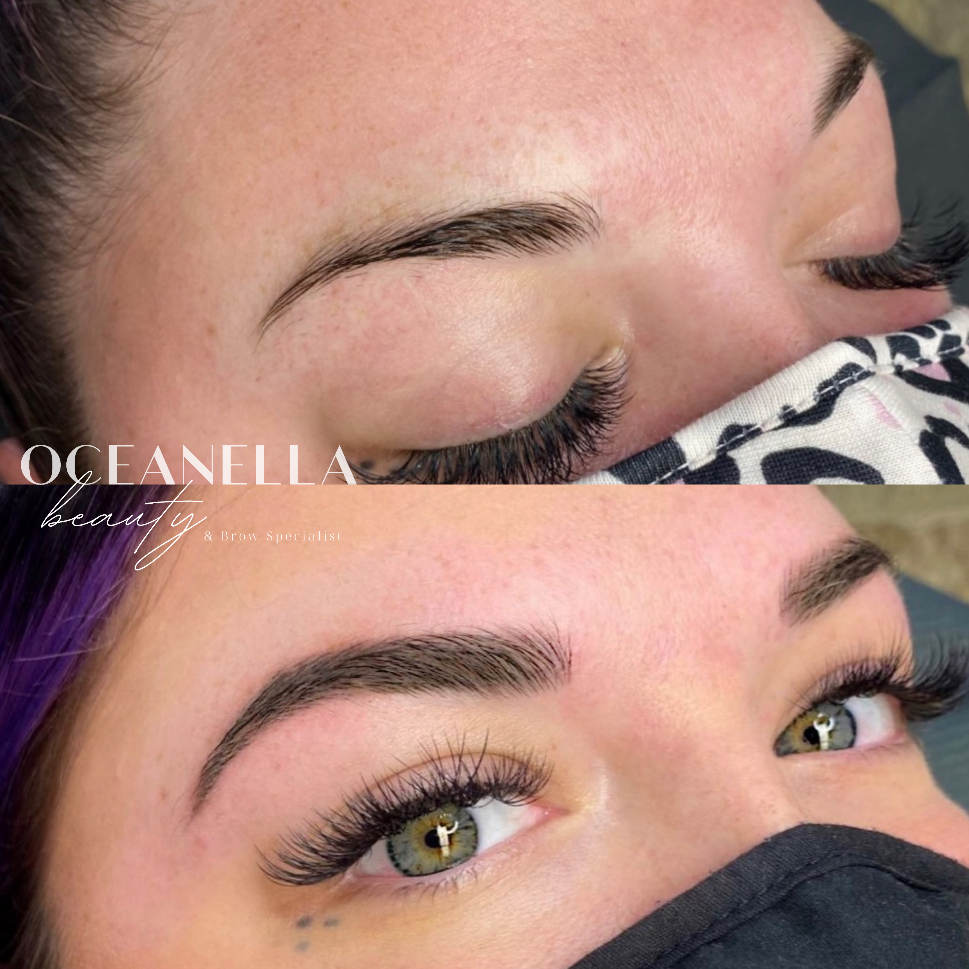 A semi-permanent technique using only a shading handheld tool. This is a fully shaded in brow with no hair strokes in the skin. This is a great option for someone who already has a good amount of eyebrow hair but wants a fuller look!